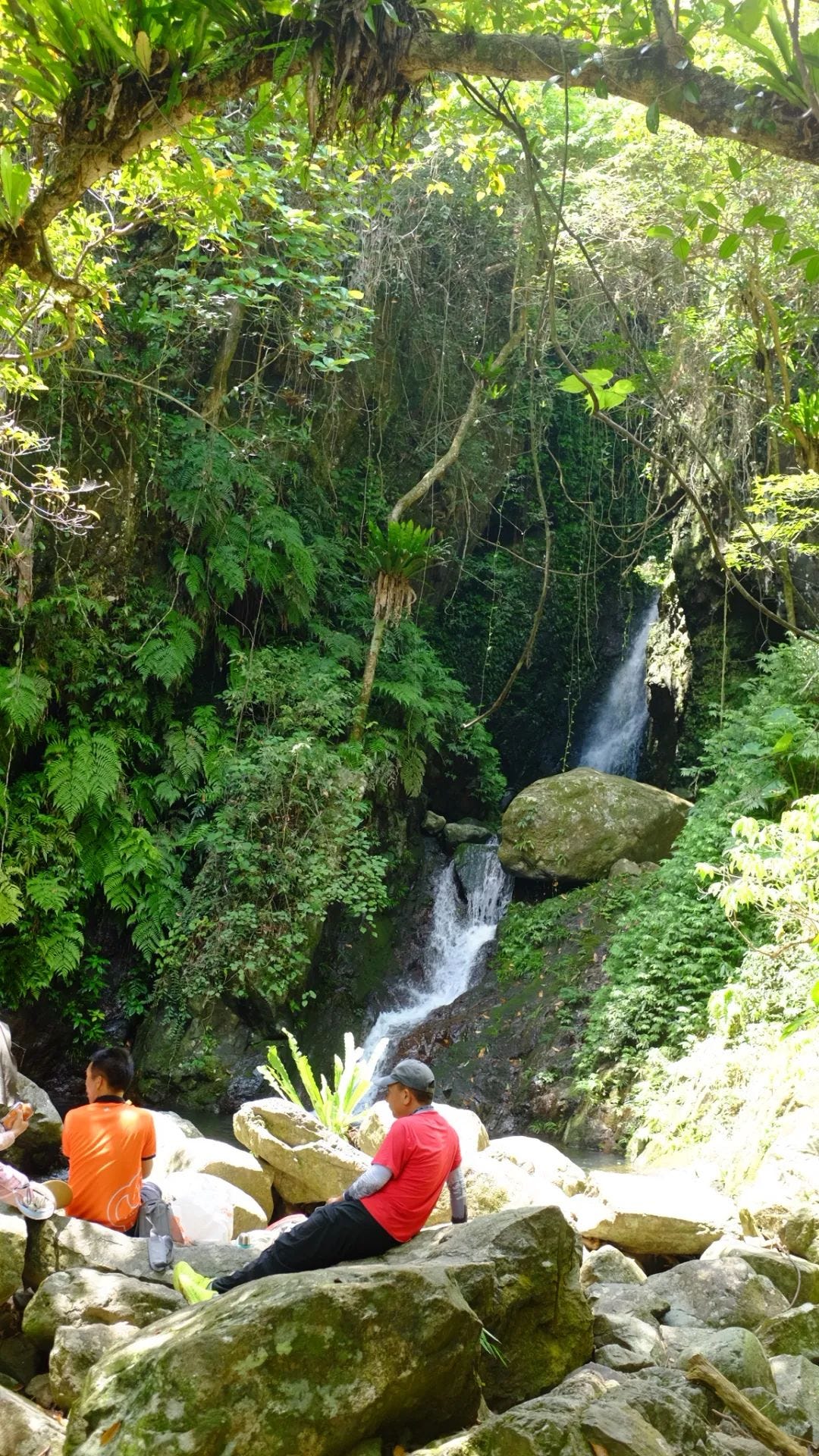 三个瀑布,底瀑、中瀑、主瀑,游人不多,涧中幽静,瀑声放大了清凉。