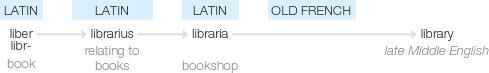 英语 library 的词源跟欧洲大陆语言不同,是来自拉丁语词根 liber,意思就是book,从这个词根演化出 libraria (a collection of books) 和 librarium (a container for books).