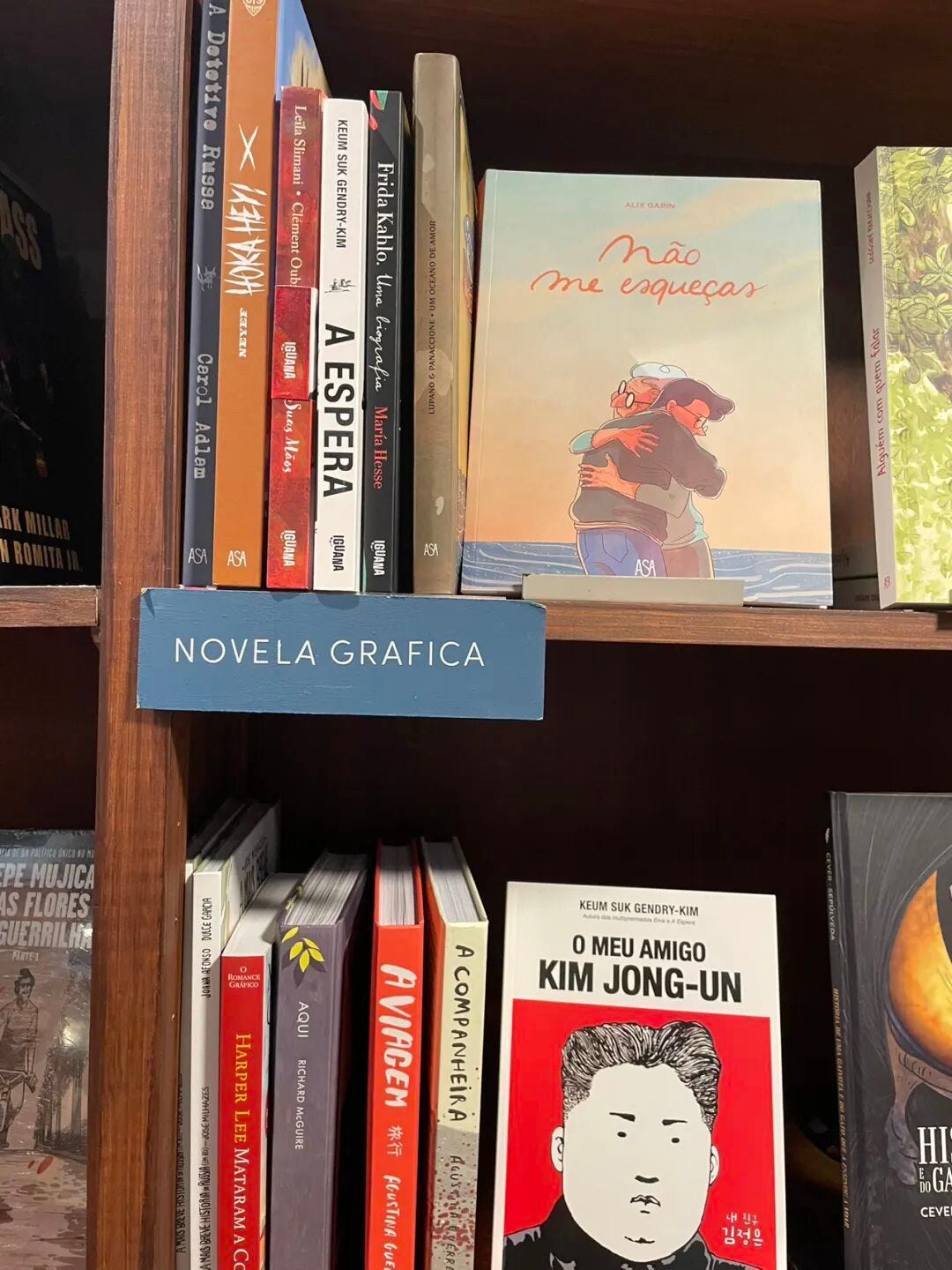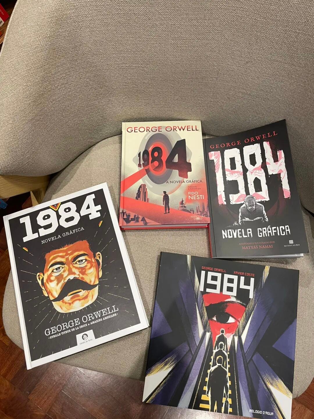 书店并不算大,地上两层,地下一层,有一排书架专卖各种漫画书。昨天我在这里第一次见到了五个不同版本的1984漫画书。作为一个把《1984》读了不下40遍的狂热爱好者,我怎么会错过这个机会呢——在老婆的支持下,果断买下一本葡语版《1984》漫画。