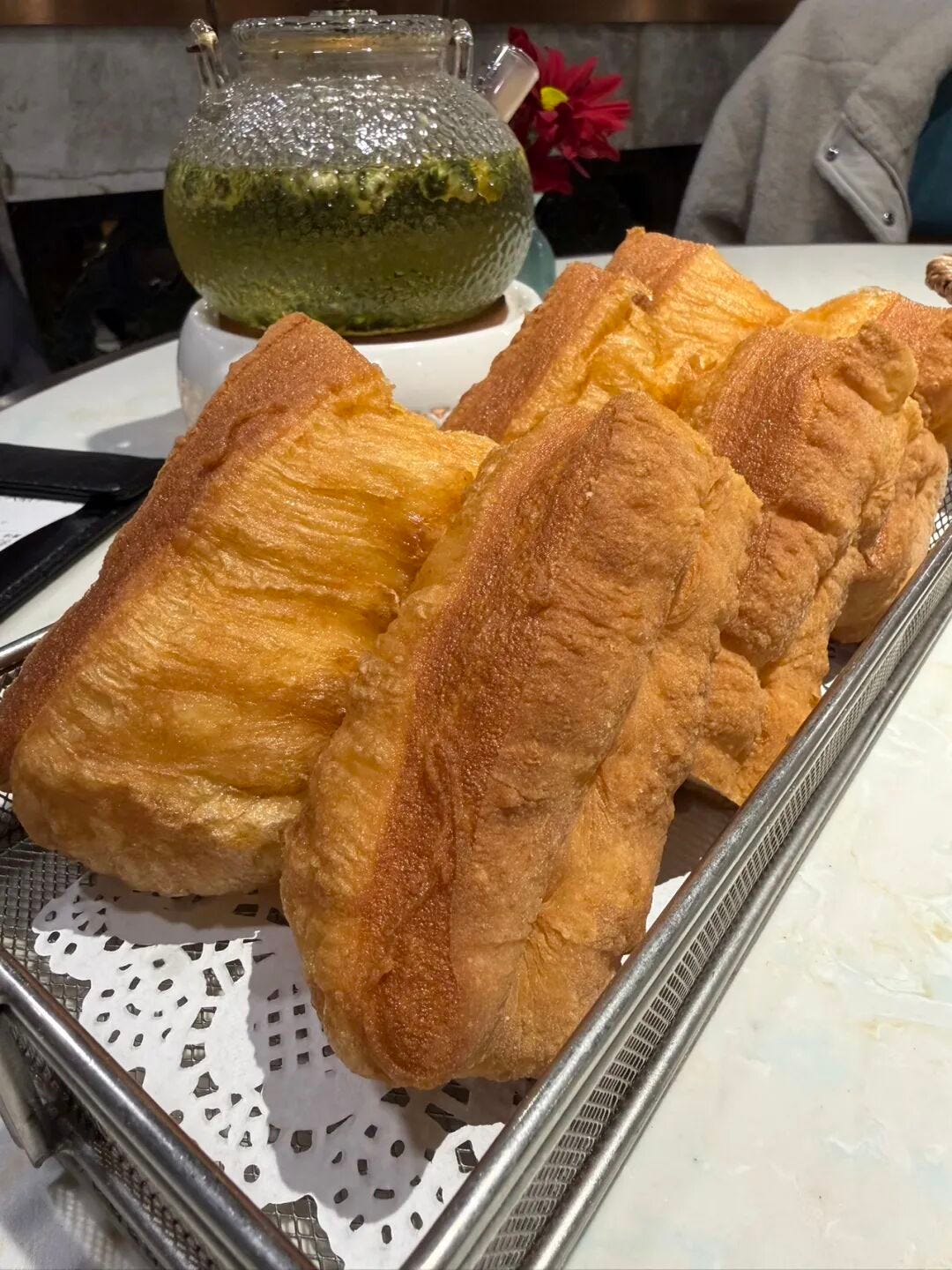 2. 这家广东餐厅炸得好油条,又胖又酥,几乎每桌必点。只有一个问题——上海人吃油条习惯蘸酱油,但广东人没这习惯,因此每次服务员端上有条来我们都要说一句“拿碟酱油好吗?”服务员旋即拿来一碟酱油。