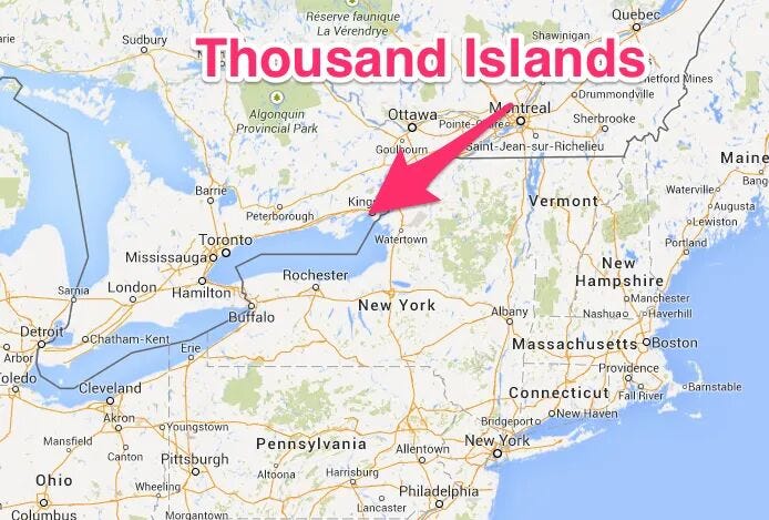 Thousand Island dressing(千岛酱)的来历其实挺神秘的,至今也没有一个完全确定的起源版本,有几种传说,大都指向美国纽约州和加拿大交界的Thousand Islands(千岛群岛)地区,那里有近1900个小岛,是19世纪末到20世纪初富豪们的热门度假地。