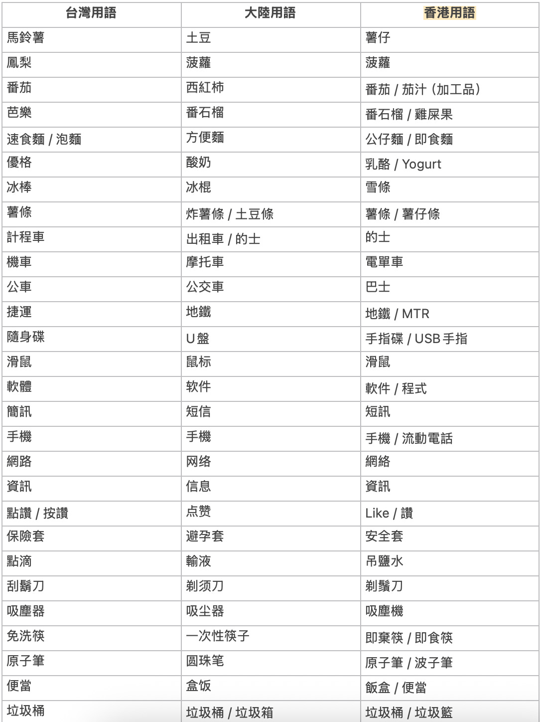 附:港台与大陆常见词汇差异表