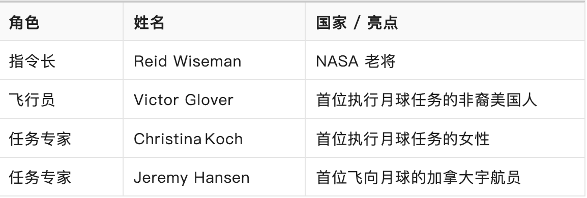 飞船上有四名宇航员(三个美国人,一个加拿大人):